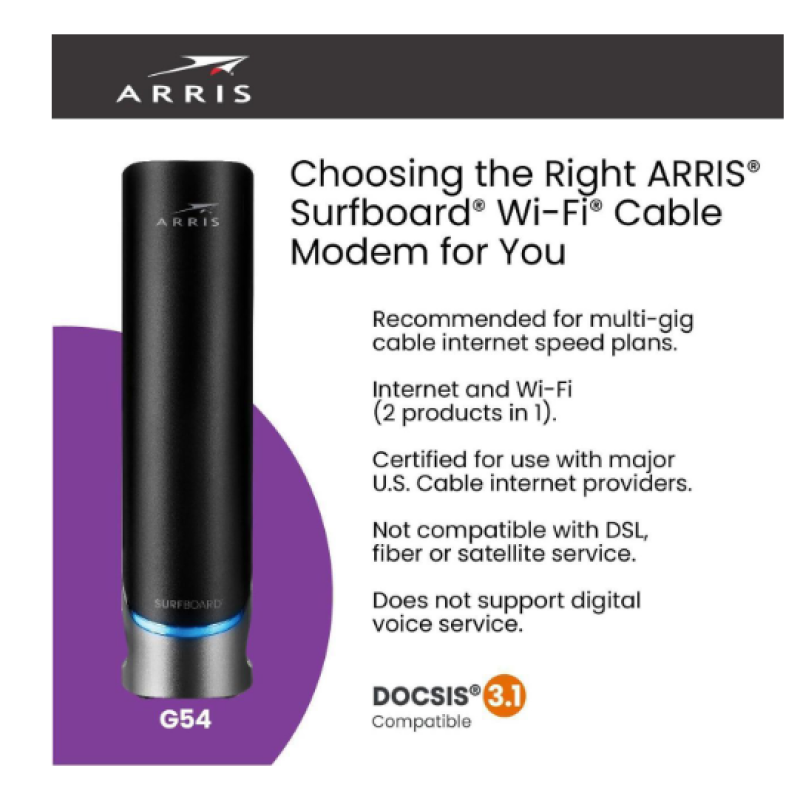 - Included Components ARRIS SURFboard G54 Cable Modem, Power Supply, and Quick-Start guide