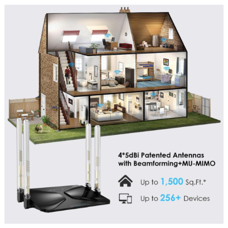 - Expanded Coverage & More Devices: 4 high-gain external antennas and Beamforming technology combine to extend strong, reliable Wi-Fi throughout your home with coverage up to 1,500 sq.ft. Support OFDMA+MU-MIMO, this router improves the network utilization rate and solves the problem of simultaneous communication with 256+ wireless terminals.